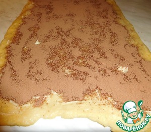 Посыпать смесью какао-сахар и свернуть в рулет, по короткой стороне.