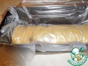 Рулет убрать в форму, смазанную маслом, накрыть пакетом или пленкой (по поверхности теста) и отправить на ночь в холодильник.