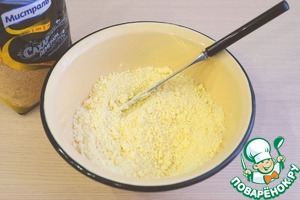 В миску добавить муку (1 стакан)., добавить сливочное масло (100 гр.)