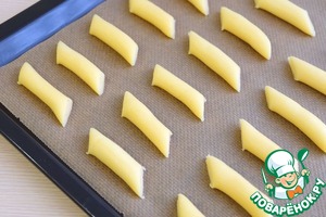 Тесто разделить на 2-3 части. Тесто скатать в жгутики-палочки. Тесто очень податливое, лучше скатывать его в руках. Нарезать наискосок брусочки. Таким образом поступить с остальными кусочками теста.
