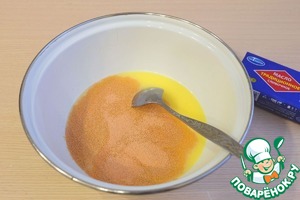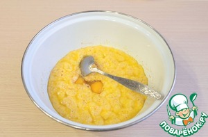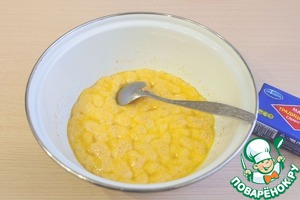 Через определенное время на поверхности образуется шапочка из мелких пузырьков, смесь размешать, добавить яйца (2 шт.), добавить соль (1/2 ч. ложки). Смесь взбить.