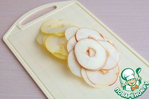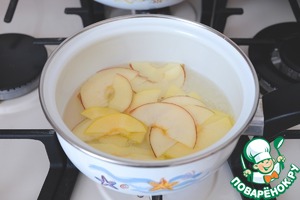 В емкость добавить 1 стакан воды, добавить 3 ст. ложки сахара, поставить на огонь, помешивая, дать закипеть, затем поместить яблочные слайсы на 1-1,5 мин. для размягчения. Этого времени вполне достаточно, что бы слайсы стали пластичными.