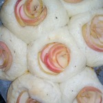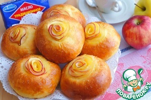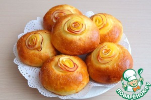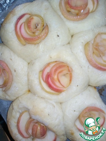 В булочках пестиком или рукой сделать углубления, поместить в них яблочные розы.