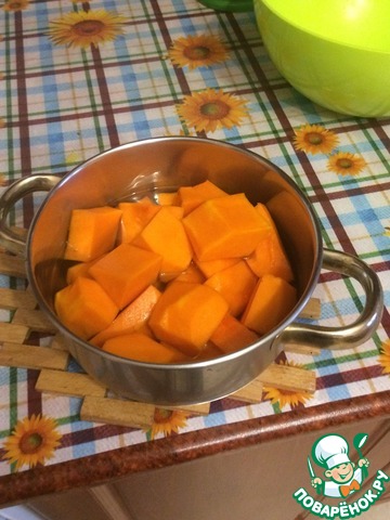 Далее займемся тыквой, очистим ее от кожуры, порежем на кусочки и поставим вариться на 20-30 мин. Воды добавить столько что бы она покрыла тыкву наполовину