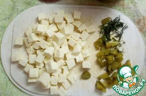 • Брынзу, огурчики и пару веточек укропа порезать.