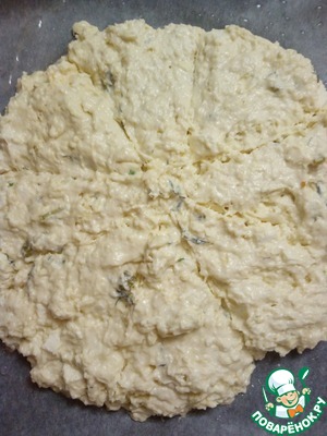 • Распределить тесто по противеню, стараясь сформировать круг. Тесто довольно жидкое, похоже на оладьи.