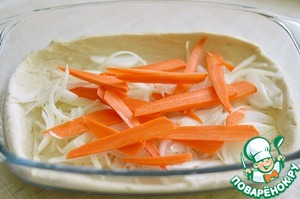• Лук и морковь почистить, нарезать произвольно. Выложить на тесто.