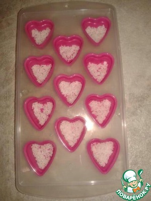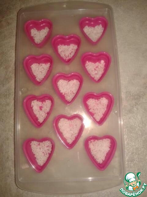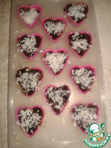 У меня формочка состоит из 11 сердечек-они силиконовые. Мне просто для дочки хотелось покрасивее. Но можно потом ингредиенты (чернослив+изюм) скатать в шарик и обвалять в кокосовой стружке и в середину ещё можно орешек добавить. Но в свои формочки добавила кокосовую стружку для того, чтобы кокосовая стружка получилась с двух сторон конфеты