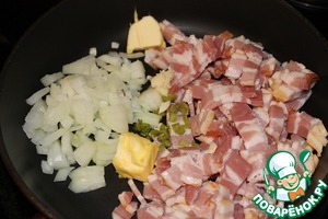 Для начинки: лук, перец чили и бекон нарезать мелкими кубиками, обжарить в 2 ст. л. сливочного масла до золотистого цвета.