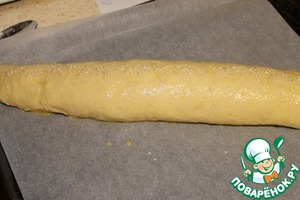 Тесто раскатать в пласт 3-5 мм, выложить и разровнять начинку.
