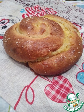 Затем скручиваем рулет спиралью наподобие домика улитки. Кончик рулета загибаем под низ. Смазываем пирог яйцом. И ставим в духовку, разогретую до 180 градусов. Я выпекала пирог минут 35-40.
