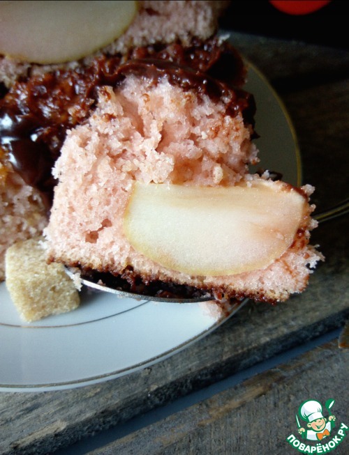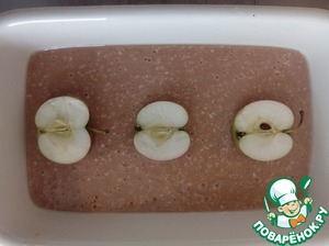 Вылить тесто в форму смазанную растительным маслом. И теперь прячем сюрприз. Яблоки помыть, разрезать на 2 части, погрузить в тесто так, как показано на фото. Если хотите чтобы яблоки были видны на поверхности пирога, то выбирайте крупные плоды. Выпекать при 180° в духовке до сухой спички. При подаче каждый кусочек или же весь пирог полностью, полить растопленным шоколадом.