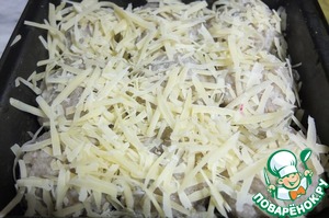 Тефтели посыпаем тертым сыром. Сверху выкладываем соус.
