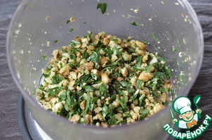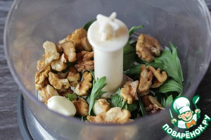 В измельчитель сложить грецкие орехи, крупно нарезанную зелень (кинзу можно вместе со стеблями, а базилик и петрушку - только листочки) и нарезанные зубчики чеснока.