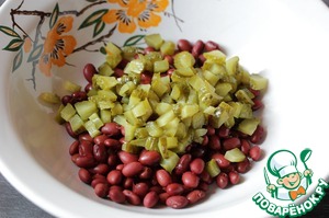К фасоли добавить маринованные огурчики, нарезанные на мелкие кубики (по размеру они должны быть как измельченные орехи).