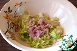 Красный сладкий лук нарезать на маленькие кубики и добавить к салату.