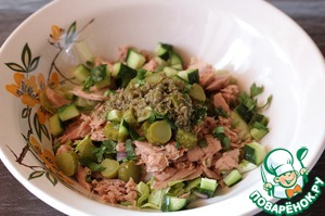 Добавить свежий и маринованный огурец, нарезанный на кубики. Соотношение должно быть примерно 1:1.