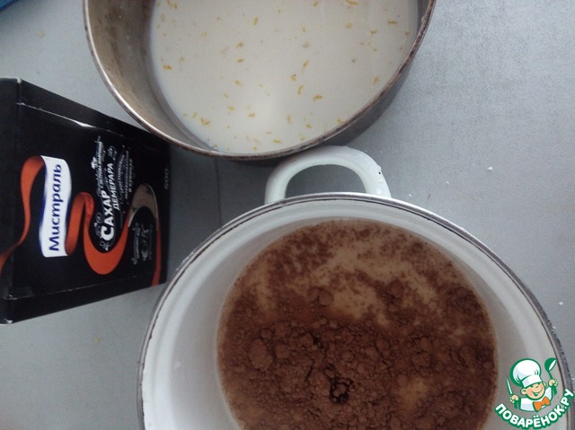 Молочно-мучную смесь делим на 2 части. В одну часть добавляем цедру (1ч. л), в другую какао и коньяк. Тщательно размешиваем.