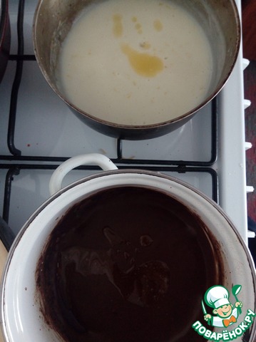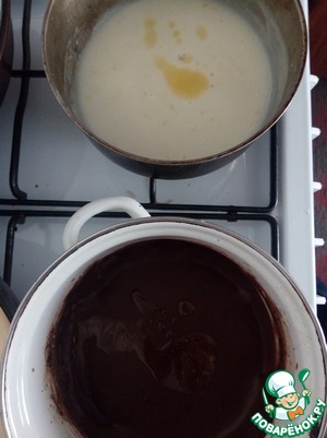 Лимонную и шоколадную составляюшие десерта на маленьком огне доводим до кипения и варим постоянно помешивая до загустения массы. Затем вводим в каждую часть по 0.5 ст. л масла. В лимонную часть вводим сок лимона (по вкусу). Перемешиваем и даем полностью остыть.