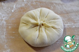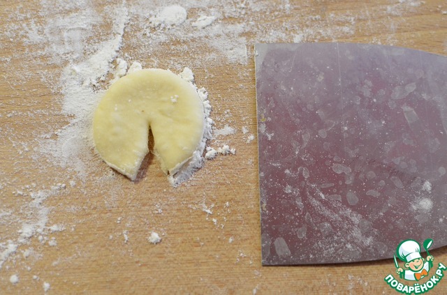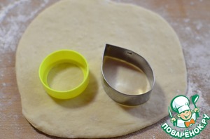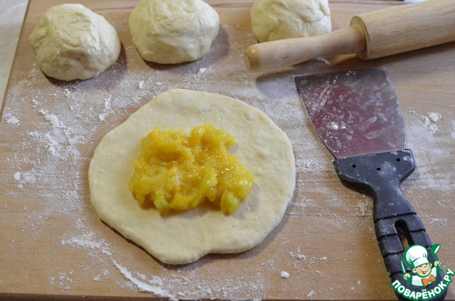 Отвесить кусочки теста по 100 грамм. Раскатать кружок, выложить 1 столовую ложку остывшей начинки.