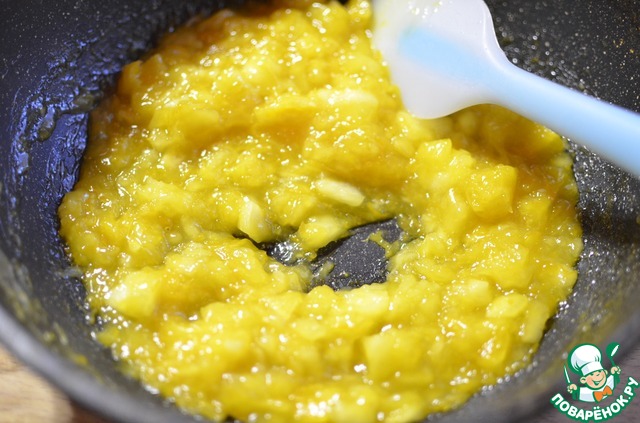 Далее добавить сахар, апельсин, цедру апельсина и яблоко. И на самом большом огне начинаем его жарить, регулярно помешивая.