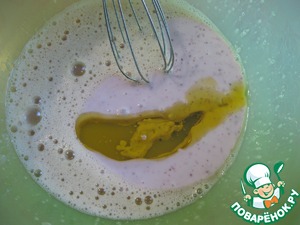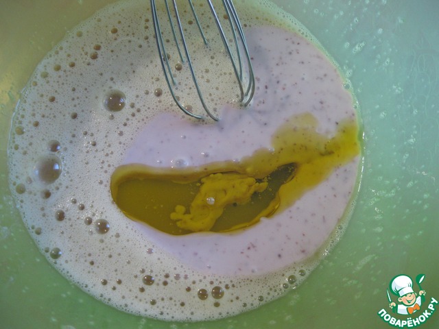 Добавить масло и йогурт (йогурт весь сразу не добавляйте, начните с половины нормы, - тут все зависит от его густоты, от муки и прочего, - если в конце тесто выйдет слишком густым, добавьте весь йогурт), еще раз слегка взбить венчиком