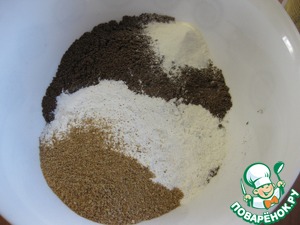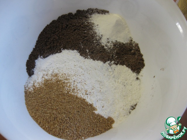В другой миске смешать два вида муки, отруби, разрыхлитель