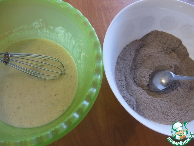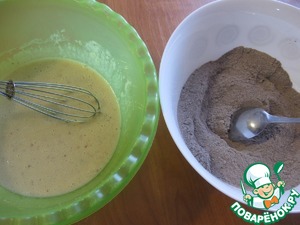 Хорошо перемешать сухие ингредиенты, добавить их в яичную смесь, вымешать, - тесто должно быть как густая сметана