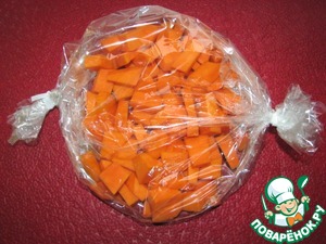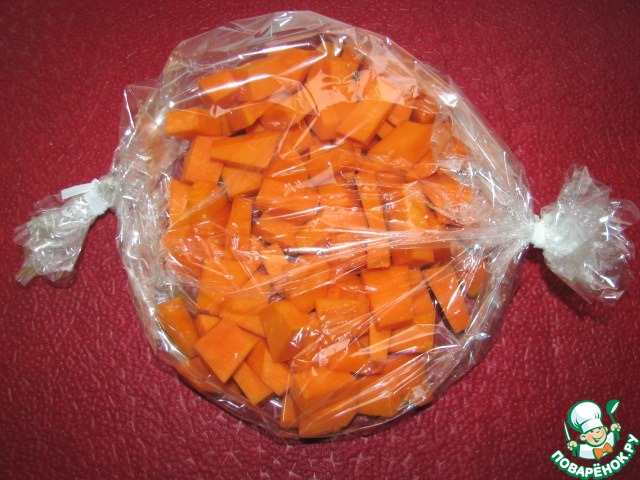 Тыкву очистить, нарезать небольшими кубиками. Положить в пакет для запекания и отправить в предварительно разогретую до 200 град духовку на 30 мин.