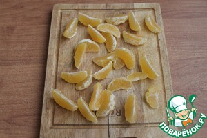 Мандарины вымоем, очистим от кожуры и разберем на дольки. Большую часть измельчим в блендере в пюре, оставшиеся дольки разрежем пополам.