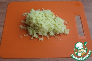 Картофель очистим, отварим до готовности, немного остудим и натрем на терке. Добавим яичный желток, 1 ст. л. растительного масла, мускатный орех и немного посолим. Перемешаем.