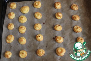 Из кондитерского шприца или мешка выдавливаем на пергамент, смазанный растительным маслом, розочки любого размера. Мне больше нравятся маленькие. Слегка смазываем яичным белком. Запекаем в духовке при 200-220 градусах до зарумянивания около 5-8 минут.