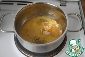 Ставим на нагрев мандариновое пюре, вливаем белое вино, выпариваем. Добавляем сахар, французские травы, куркуму, кусочки мандаринов и 25 г сливочного масла. Прогреваем до растапливания масла и отставляем с нагрева.