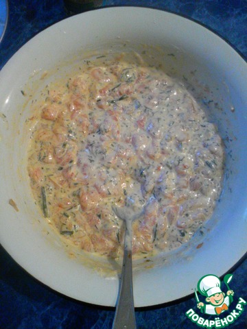 правда, сметана у нас продукт, который не купишь в ближайшем магазине, пришлось заменить имевшимся в наличии йогуртом. и майонеза у меня не было, я просто добавила ложку растительного масла и немного горчицы. вынужденная имитация. все остальное по рецепту.