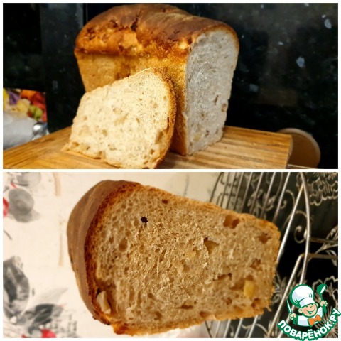 яблоки с сахаром после для в холодильнике -сахар яблоки не растворили соком, а вот когда достала из холодильника и нагрелись на столе, то сахар растаял, сок появился. молока добавила чуть больше, вместо воды - сыворотку. яблоки перед добавлением посыпала мукой, пыталась. т.к. в соке слегка еще были. муку сразу добавлять побоялась потом подсыпала во время замеса. тесто было на грани жидкого. подходило плохо, но очень хорошо подошел хлеб во время выпечки. корочку может нужно было слабую ставить. а то у меня в этом плане хлебопечка умница). вес выбирала 750 г