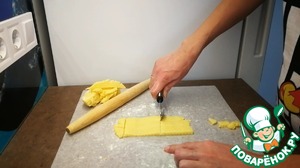 Затем раскатываю тесто частями, поскольку в случае с безглютеновой мукой тесто менее эластичное. Раскатываю тесто толщиной около 0,5 см, и нарезаю палочки длиной около 5 - 6 см и шириной 1 – 1,5 см.