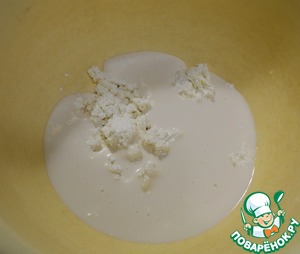 Ряженку с творогом взбиваем погружным блендером или растираем пестиком.