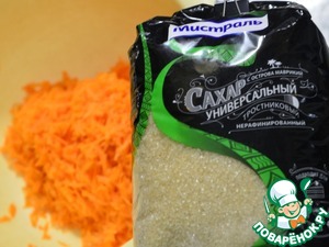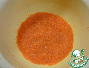Морковь натираем на мелкой тёрке, смешиваем с сахаром.