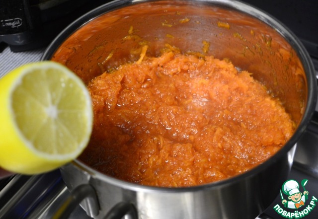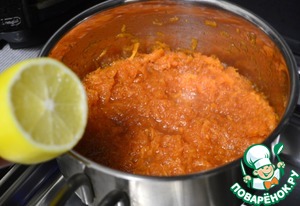 Морковную смесь выкладываем в кастрюльку. Добавляем специи и лимонный сок. Ставим на маленький огонь и варим, постоянно помешивая.