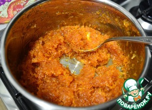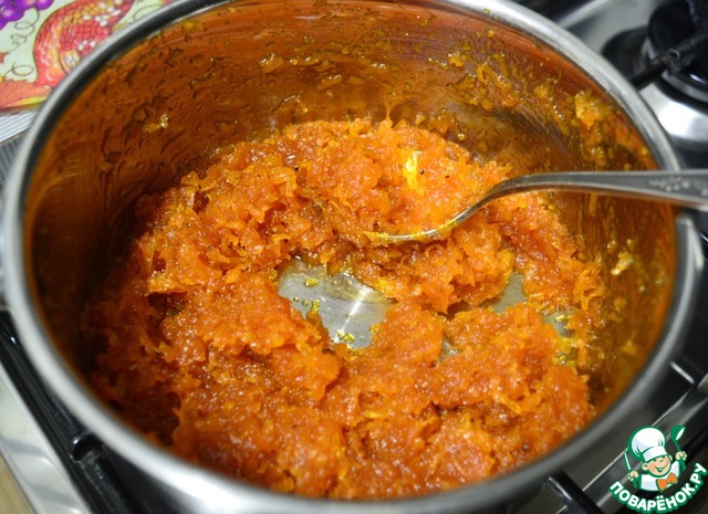 Морковь становится прозрачной, сироп загустевает. Вся масса становится вязко-липкой. Чем гуще становится масса, тем чаще нужно перемешивать.
