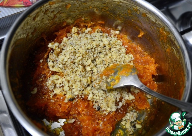 Загустевшую массу снимаем с огня, добавляем измельчённые орехи. Тщательно перемешиваем.