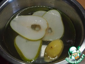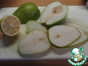 Чтобы груши не потемнели, в миску с холодной водой выдавить сок половины лимона и опустить в нее пластинки груш.
