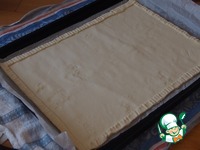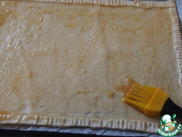 Слоеное тесто раскатать в пласт примерно 30Х20 см. Я купила уже раскатанное, осталось только развернуть рулон с тестом, пекла прямо на бумаге, в которую оно было завернуто. Сделать небольшие бортики. |