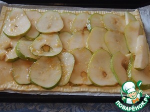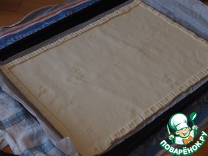 Слоеное тесто раскатать в пласт примерно 30Х20 см. Я купила уже раскатанное, осталось только развернуть рулон с тестом, пекла прямо на бумаге, в которую оно было завернуто. Сделать небольшие бортики.