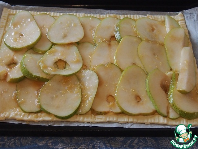 Сверху разложить груши внахлест, чтобы получился декоративный рисунок. Смазать груши оставшейся масляной смесью. Посыпать сверху оставшимся сахаром и поставить в разогретую духовку. Выпекать при температуре 200 градусов приблизительно 20 минут.