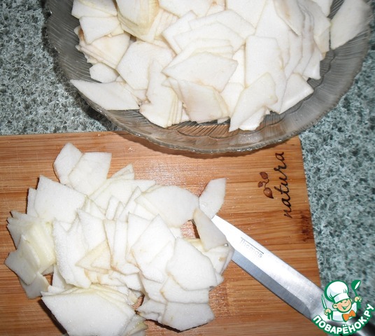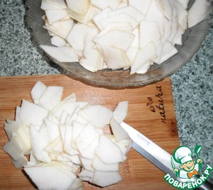 Яблоки очистить, удалить сердцевинки, нарезать тонкими пластинами.