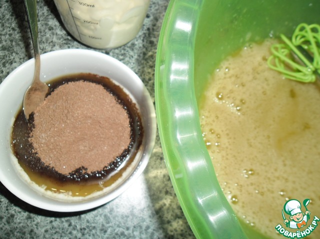 Масло сливочное слегка растопить, в половину сахара добавить какао, перемешать до однородности, соединить с растопленным маслом. В яйца добавить соль, взбить, добавить оставшийся сахар, сметану, продолжить взбивание.