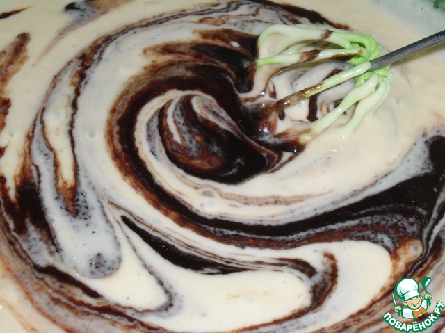 Муку смешать с содой, добавить в смесь яиц и сметаны, перемешать. Добавить смесь масла с какао, перемешать (без фанатизма)