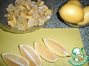 Лимоны тщательно вымыть, разрезать на четыре части, срезать носики, вынуть косточки.
