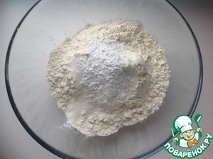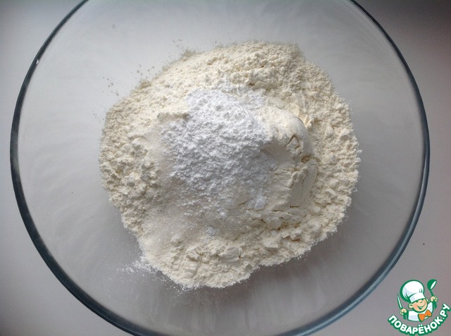 В миску добавить муку, разрыхлитель, сахар и соль, перемешать. -